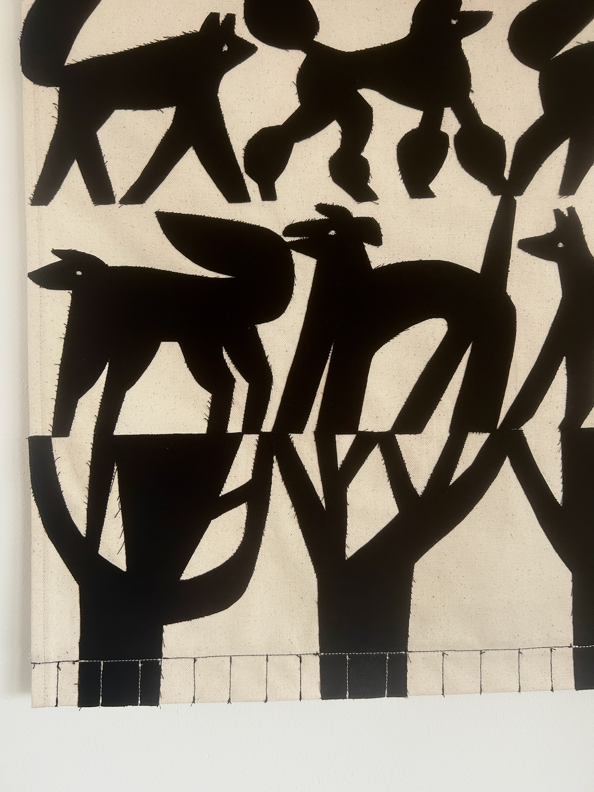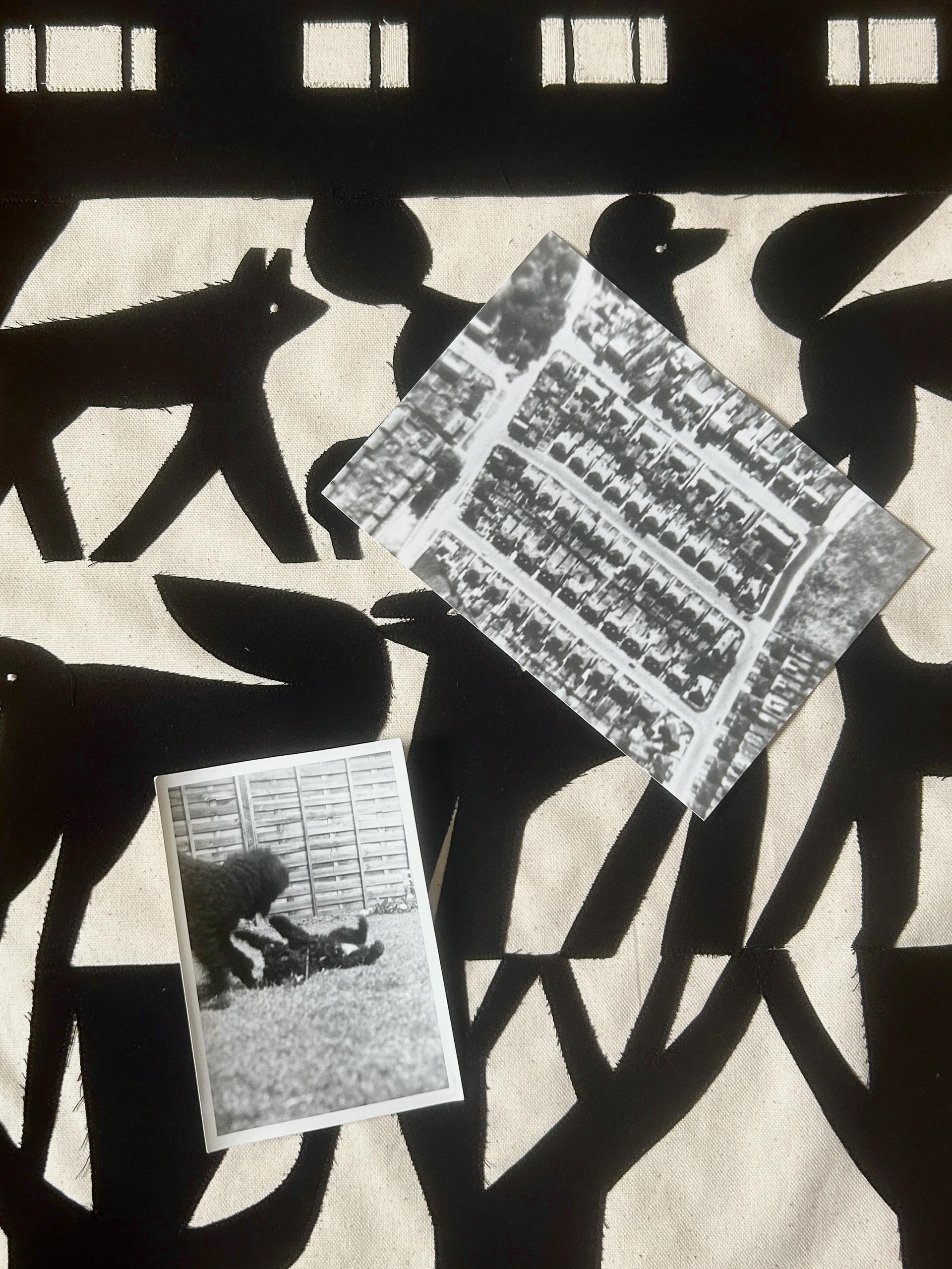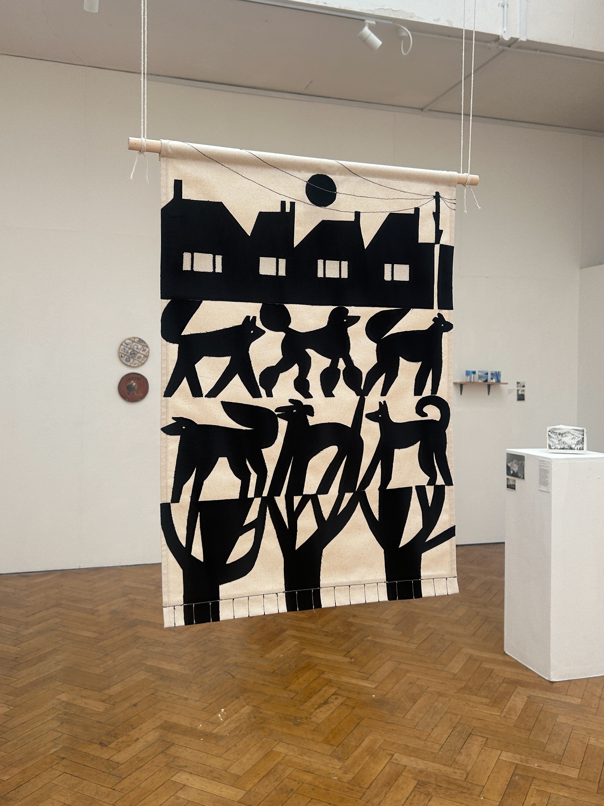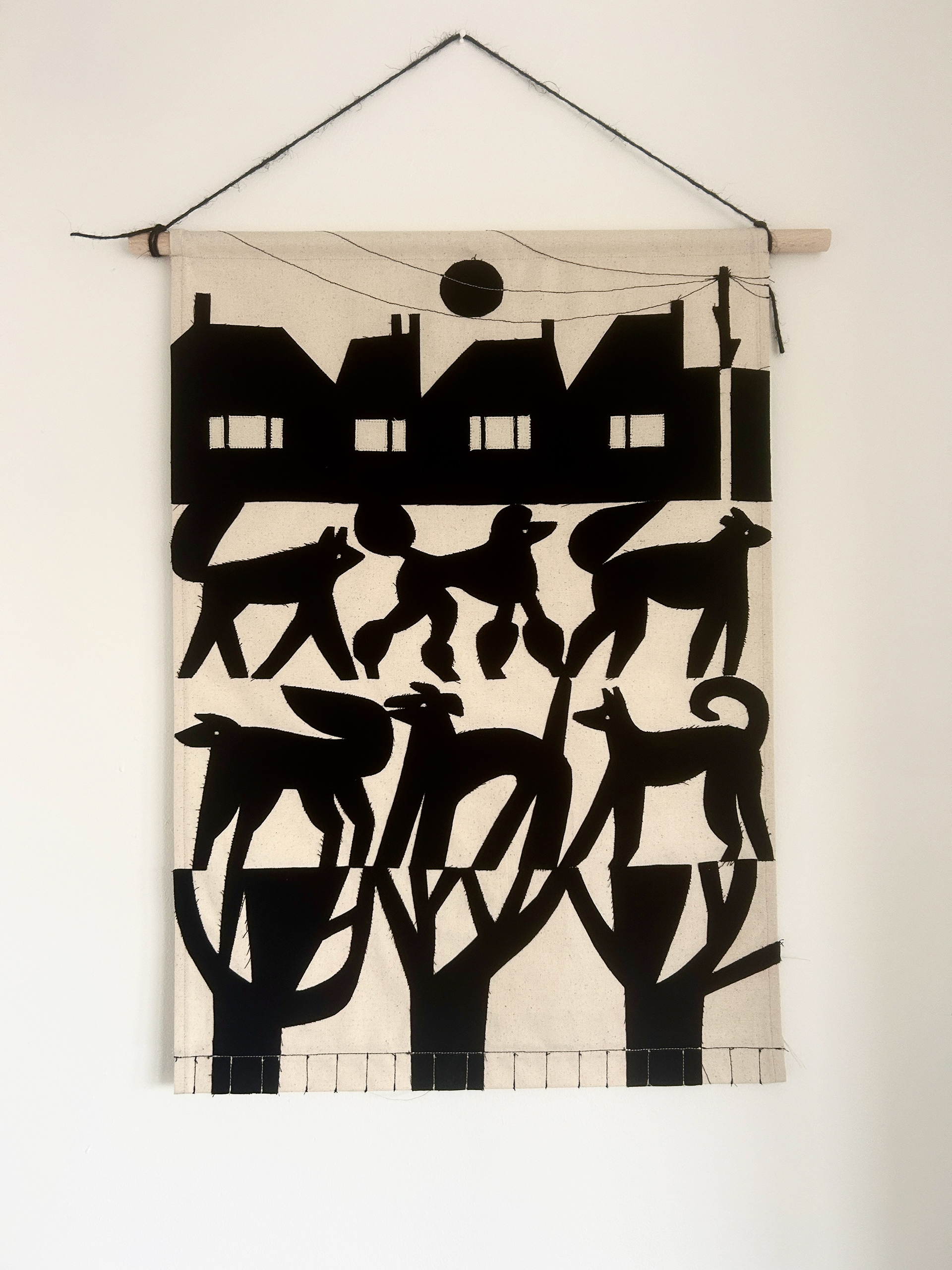 The photos I was given reminded me of stories my mum would tell me of growing up in Wythenshawe in the 70s, and how everybody would leave for work and let their dogs out. The dogs would roam the estate freely in packs all day til they would be called in for their tea ready for another day of suburbia freedom tomorrow. She also told me of vivid memories of bright white dog poo that was everywhere because of questionable 70s dog food (but there wasn’t room on the wall hanging for that)