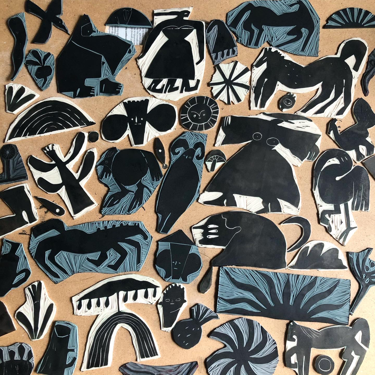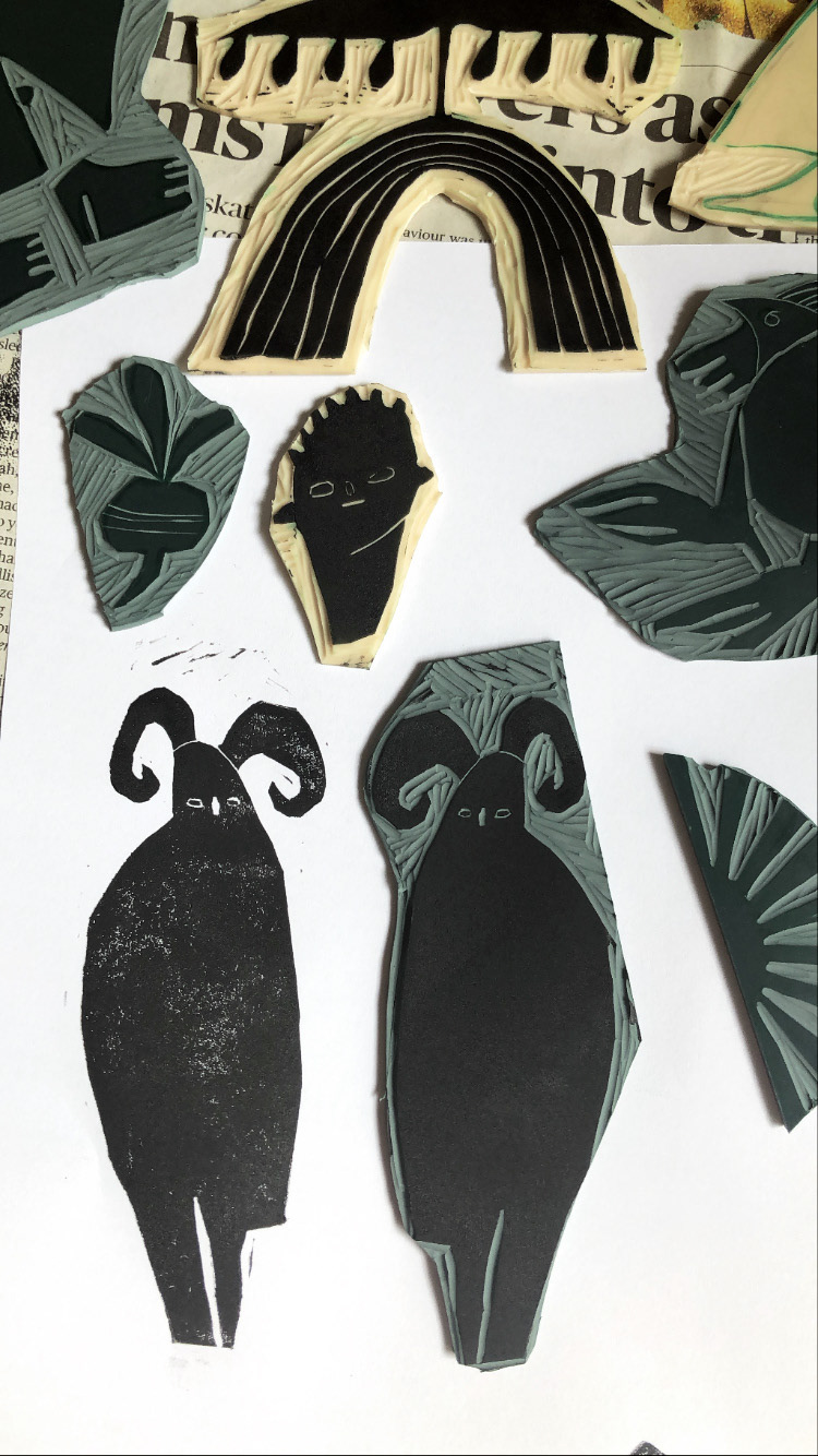 This set of lino stamps were made in response to an ongoing body of research about storytelling and the construction of stories. The stamps are all motifs pulled from the tales I had written interpreted, but I was interested in how they could be taken by others and used as a basis to create their own narratives and stories from.