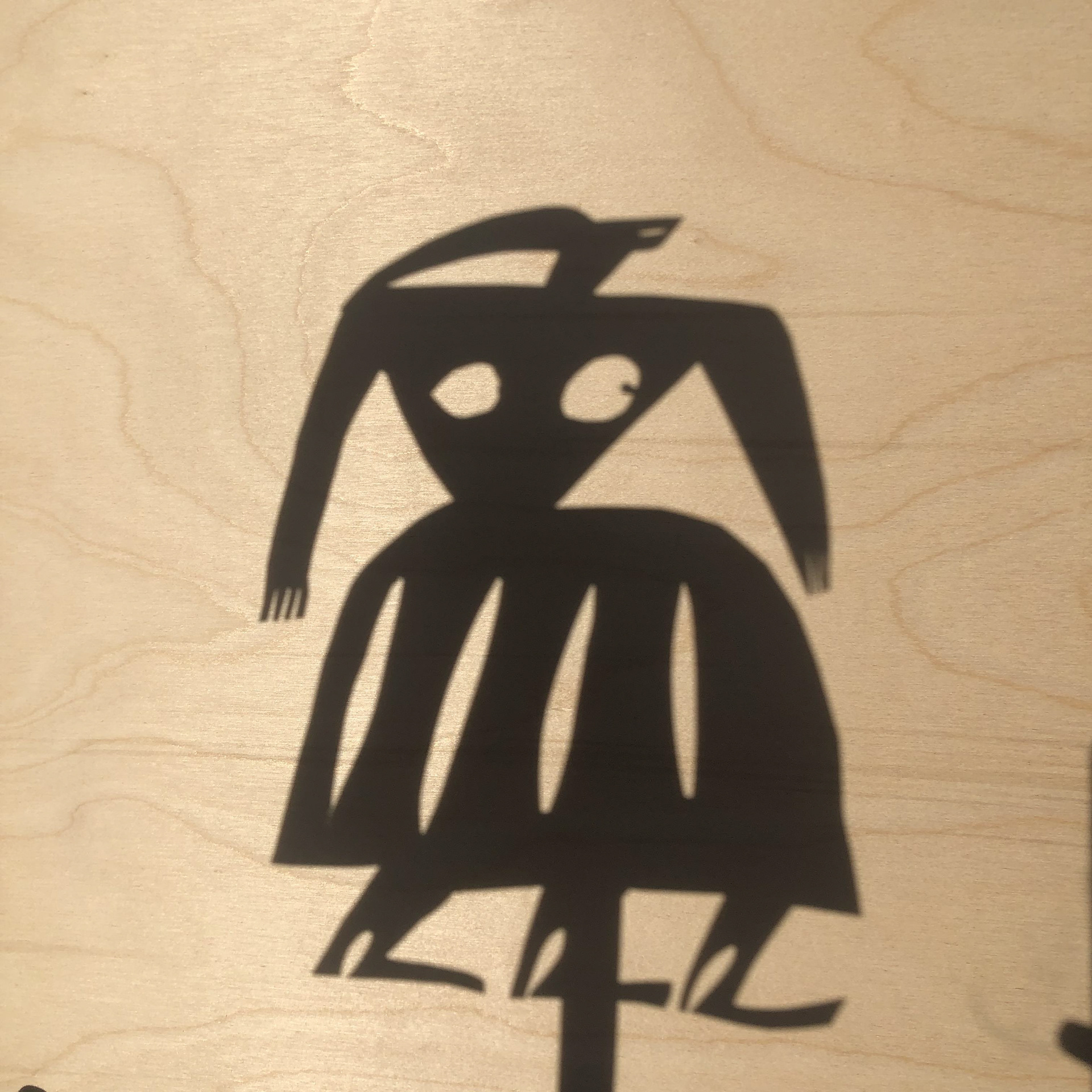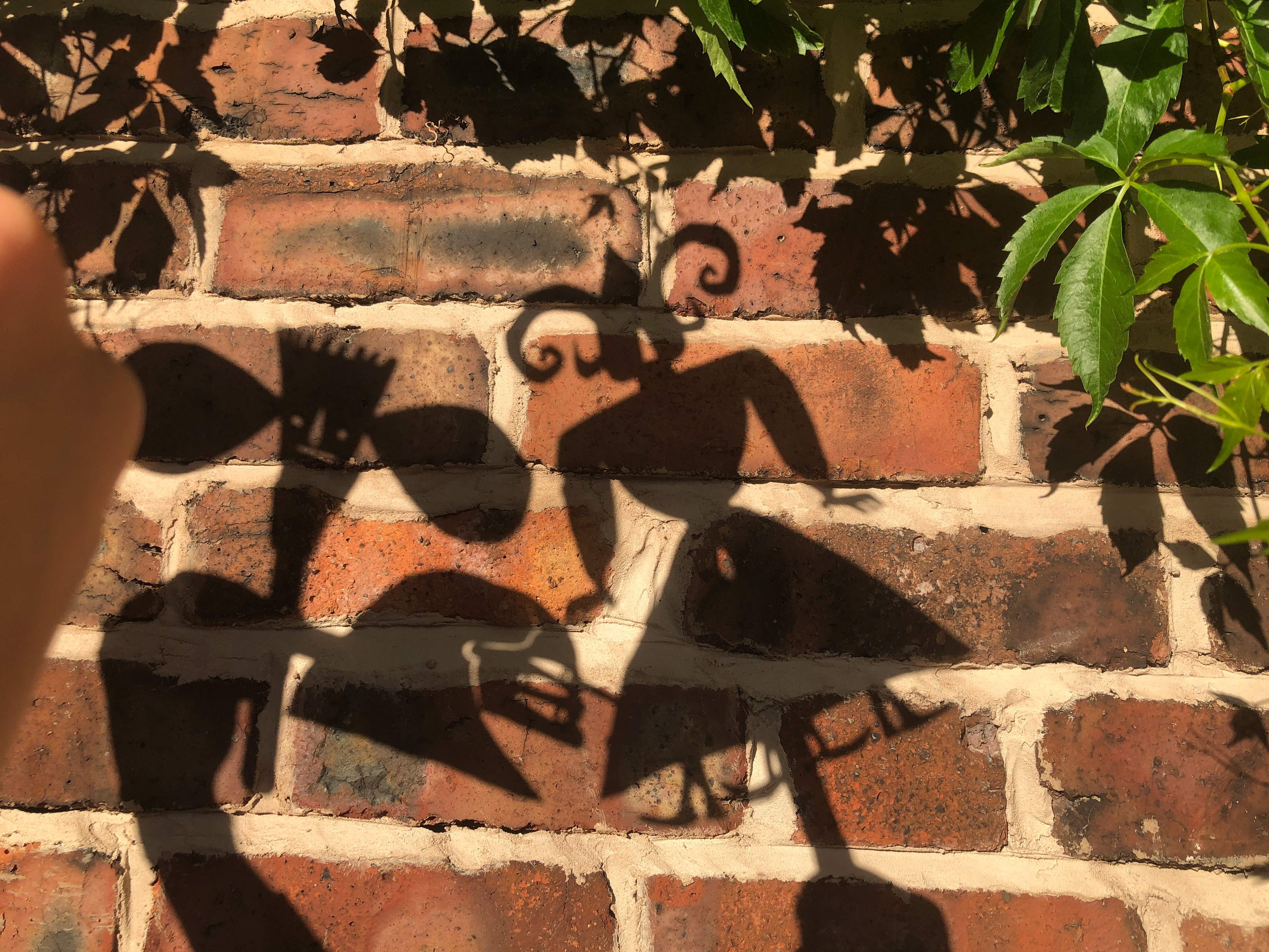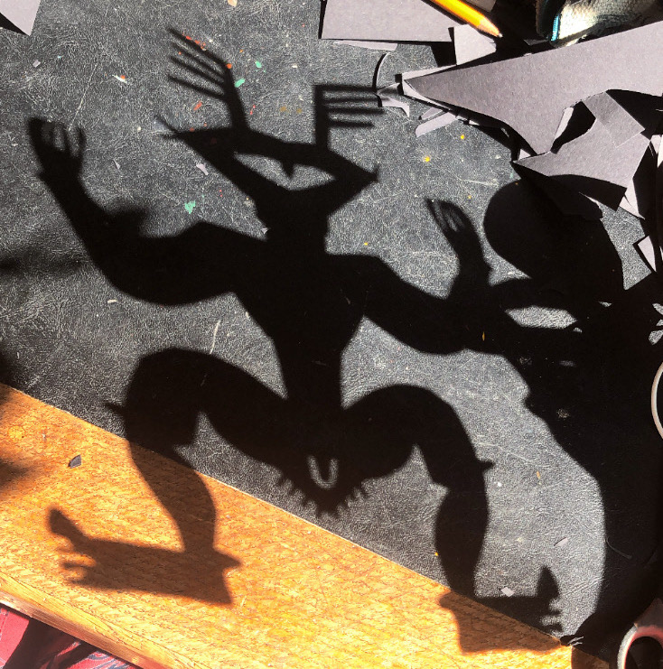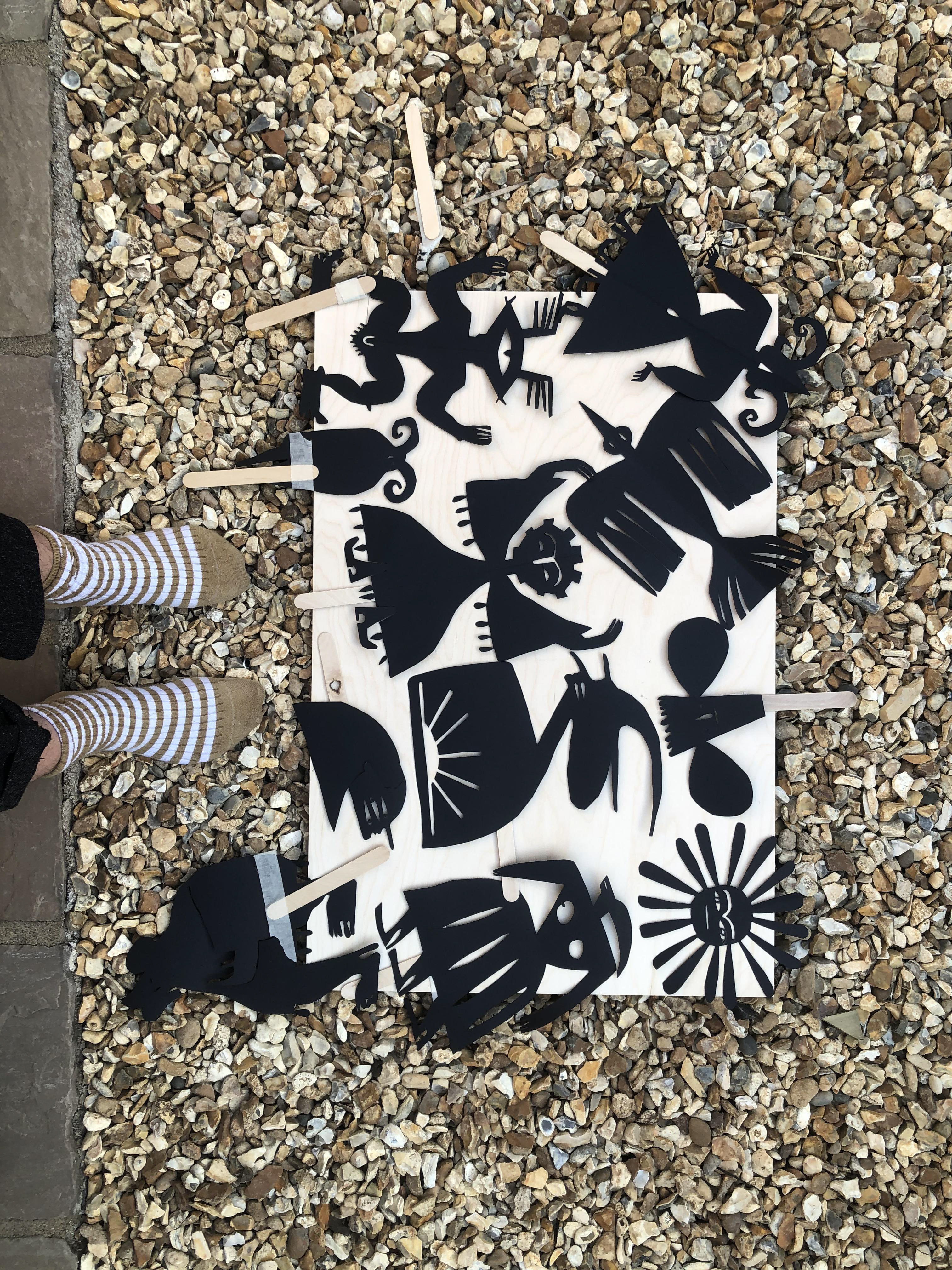 Inspired by Hans Christian Andersen's paper cuts, these puppets started out as an exercise in symmetry before I noticed the shadows the black card was creating. Similar to the idea I was playing with with my lino workshop - I'm interested in how stories I create can become vehicles of storytelling for the viewer/participant. Motifs I've created through various research and experience take on new meaning when given to someone else to play with