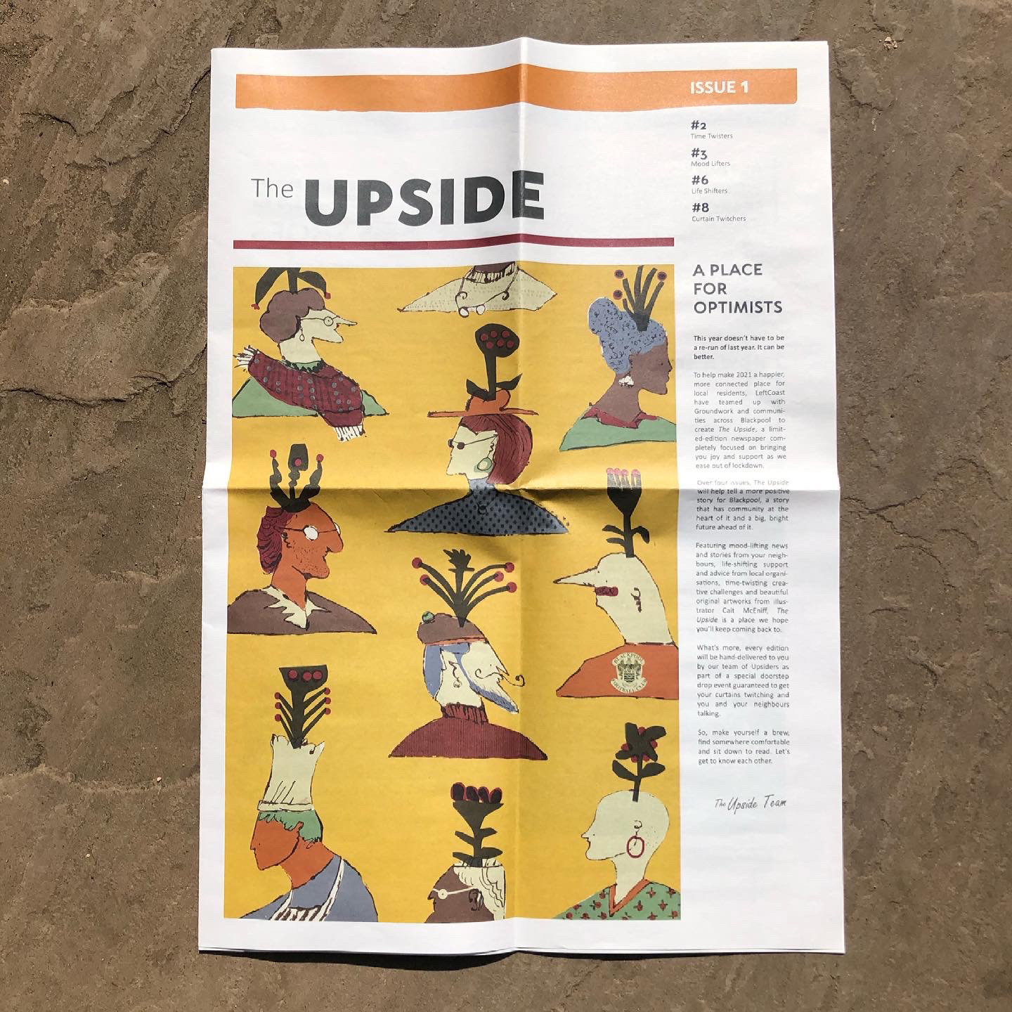 The Upside was a 4 issue long free newspaper, created during Lockdown by LeftCoast. It was distributed to some of Blackpool's most isolated residents to provide joyful and helpful content to support and connect the community. I was commissioned as the illustrator to design each front cover and spot illustrations within.